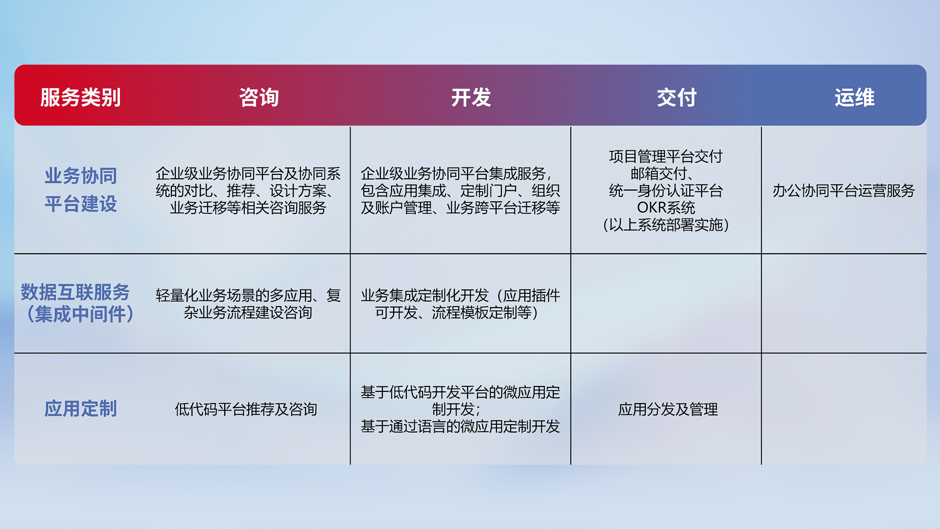 针对钉钉、、企微、、、IDaas等平台级产品提供产品的规划、、、方案、、、交付、、、、定制化开发等服务,,实现如统一协同办公、、智能客户服务、、、混合会议管理、、智能数据查询、、等业务场景,,,实现数字化转型。。。。