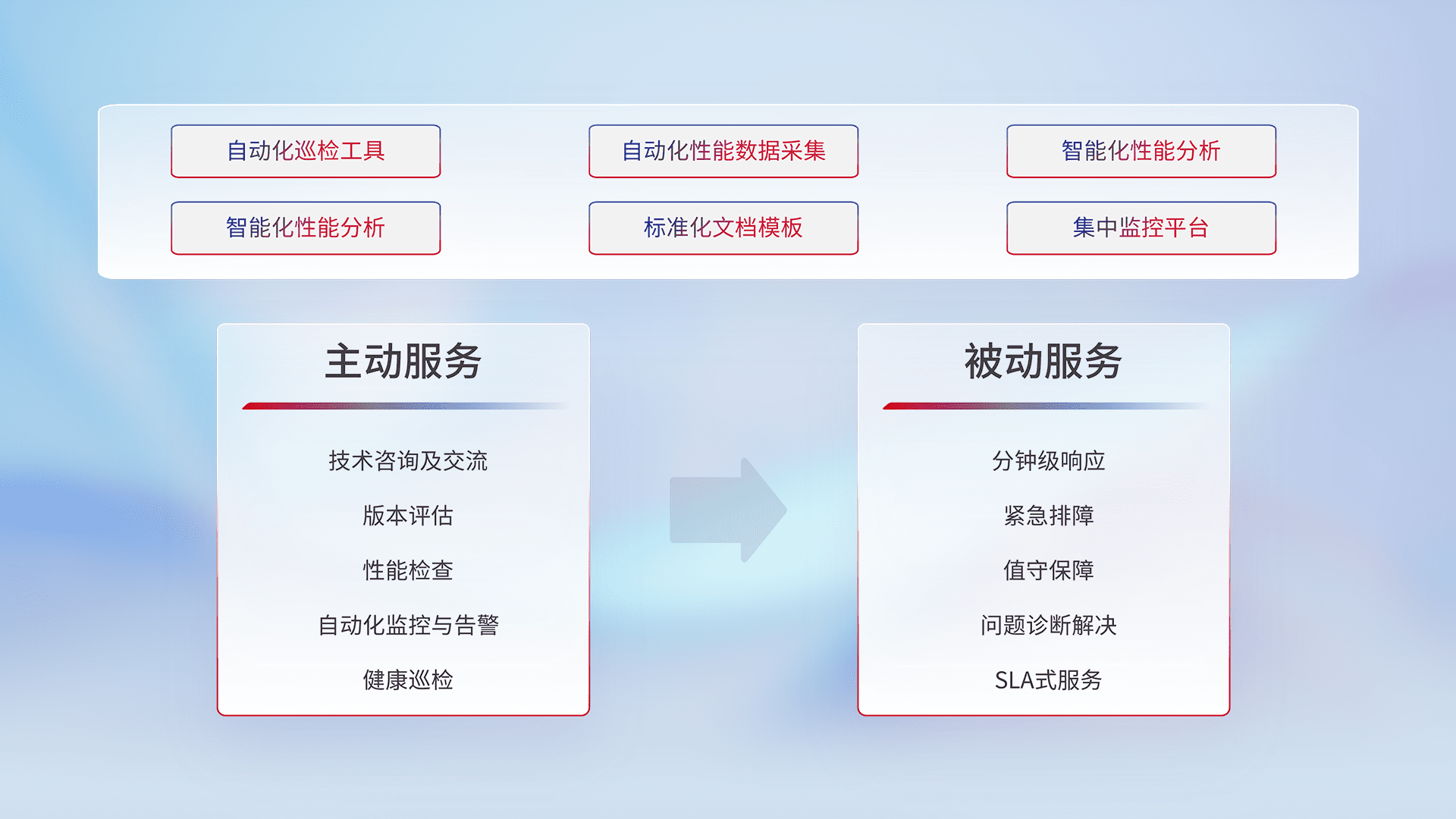 智能化工具和标准化文档,,,,保障服务质量,,,提供主动服务(包含技术咨询、、、版本评估、、、性能检查、、、、自动化监控与告警、、、、健康巡检)和被动服务包含(分钟级响应、、、紧急排障、、、值守保障、、、问题诊断解决、、、SLA服务)。。。